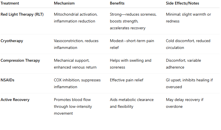 Meta-analyses comparing PBMT and cryotherapy have found red light therapy more effective than cryotherapy in reducing biomarkers like creatine kinase and inflammatory mediators. Unlike cryotherapy, which primarily provides short-term numbing effects, PBMT facilitates deep tissue healing and functional recovery. It also supports sustained performance improvements over a longer post-exercise window (24–96 hours). As a result, it is emerging as a superior option for evidence-based recovery protocols.